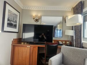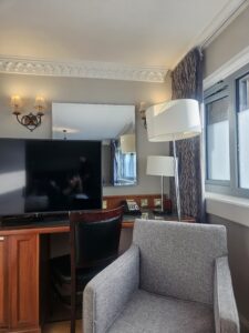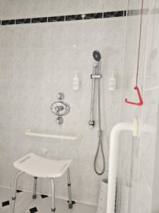 Below are photos of the accessible room we first got.  As you can see, I really felt that the room was just “thrown” together and the shower room was a bit difficult for me to use, especially whilst sitting on the low stool and trying to reach the shampoo/shower gel.  It was a very comfortable room, even though it didn’t have the view…!